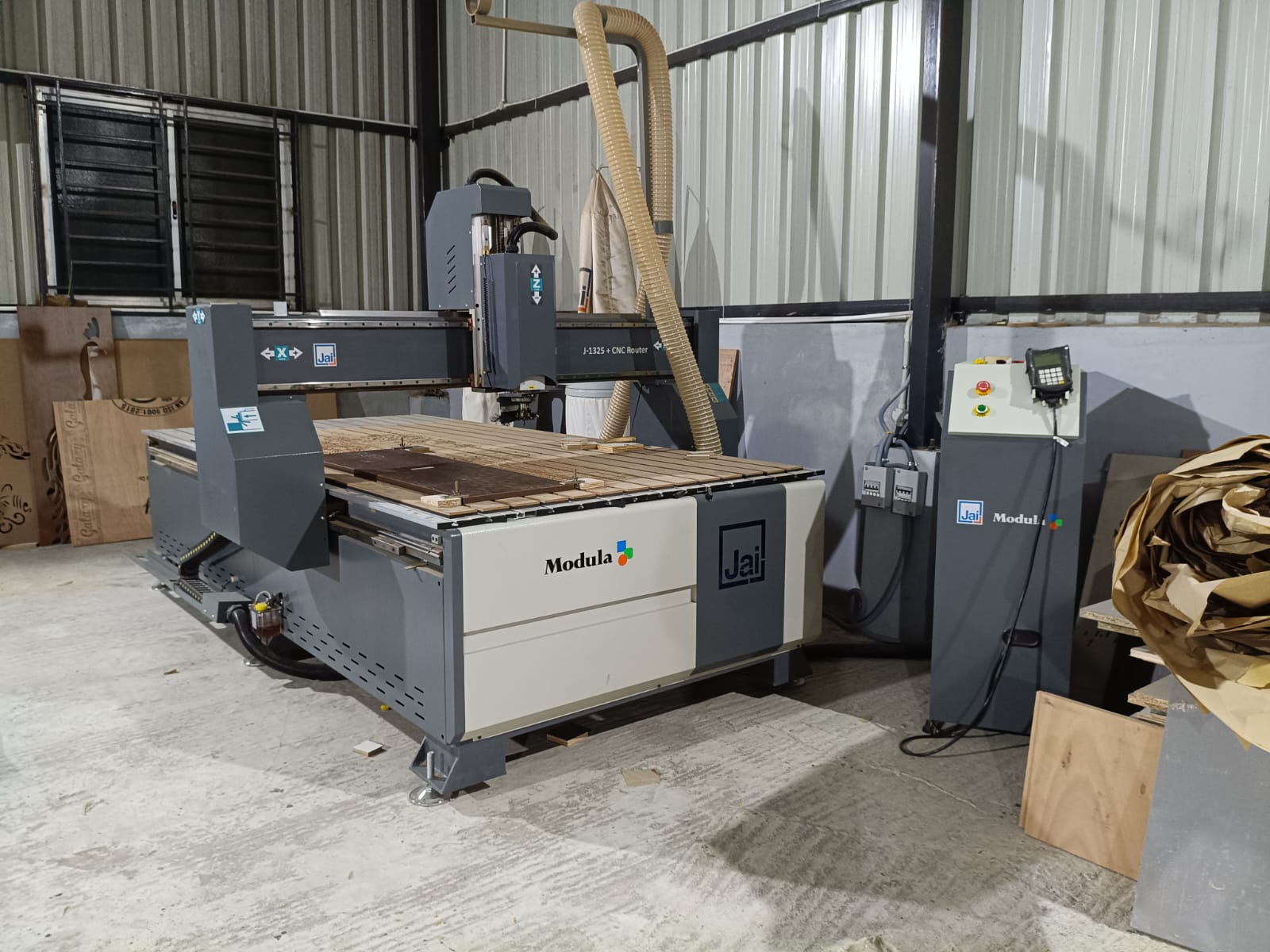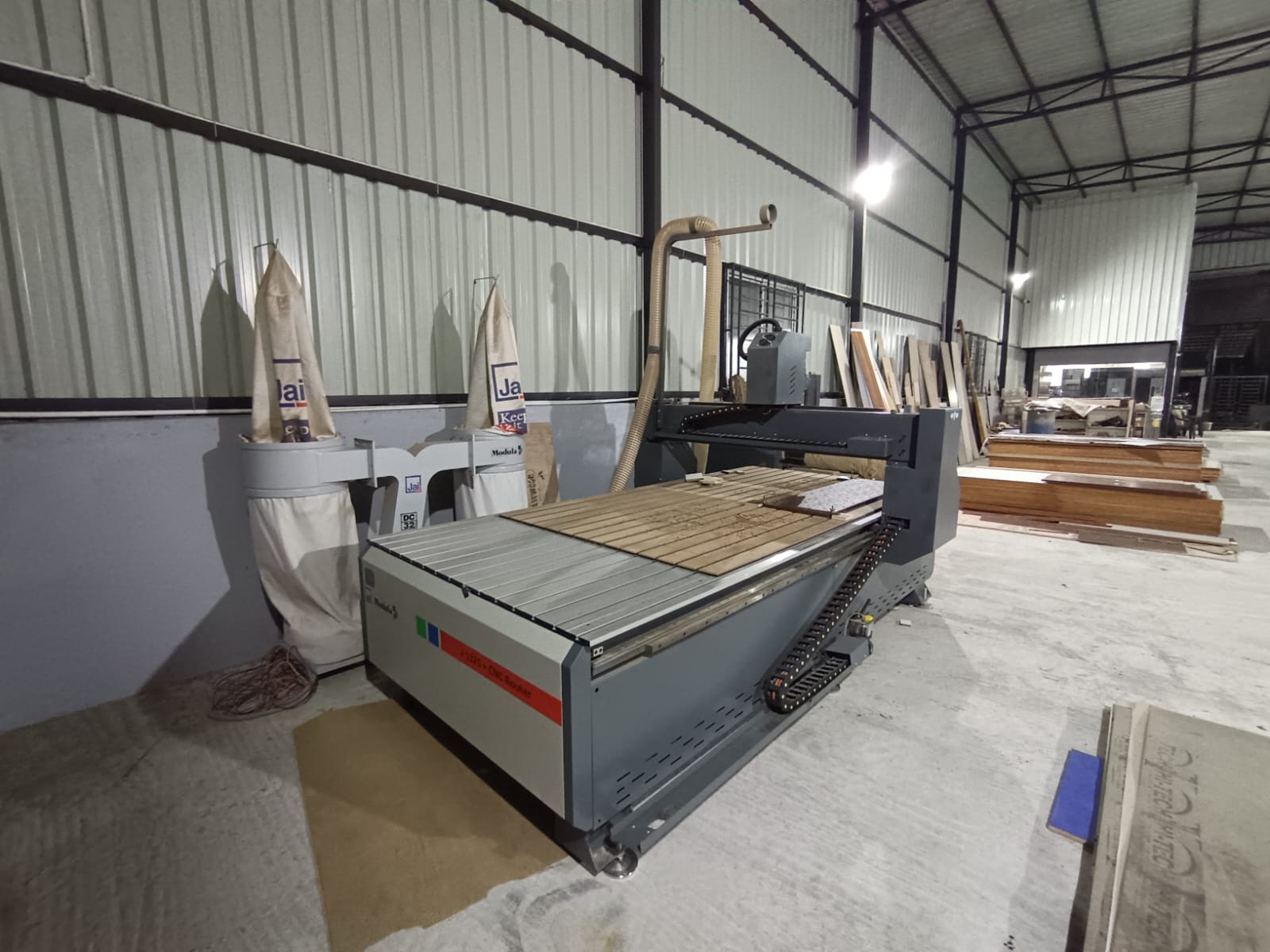 This is a CNC Router machine. We utilize this machine in our interior company's factory to execute precise work on wooden panels and other materials, thereby delivering high-quality designs to our clients.
